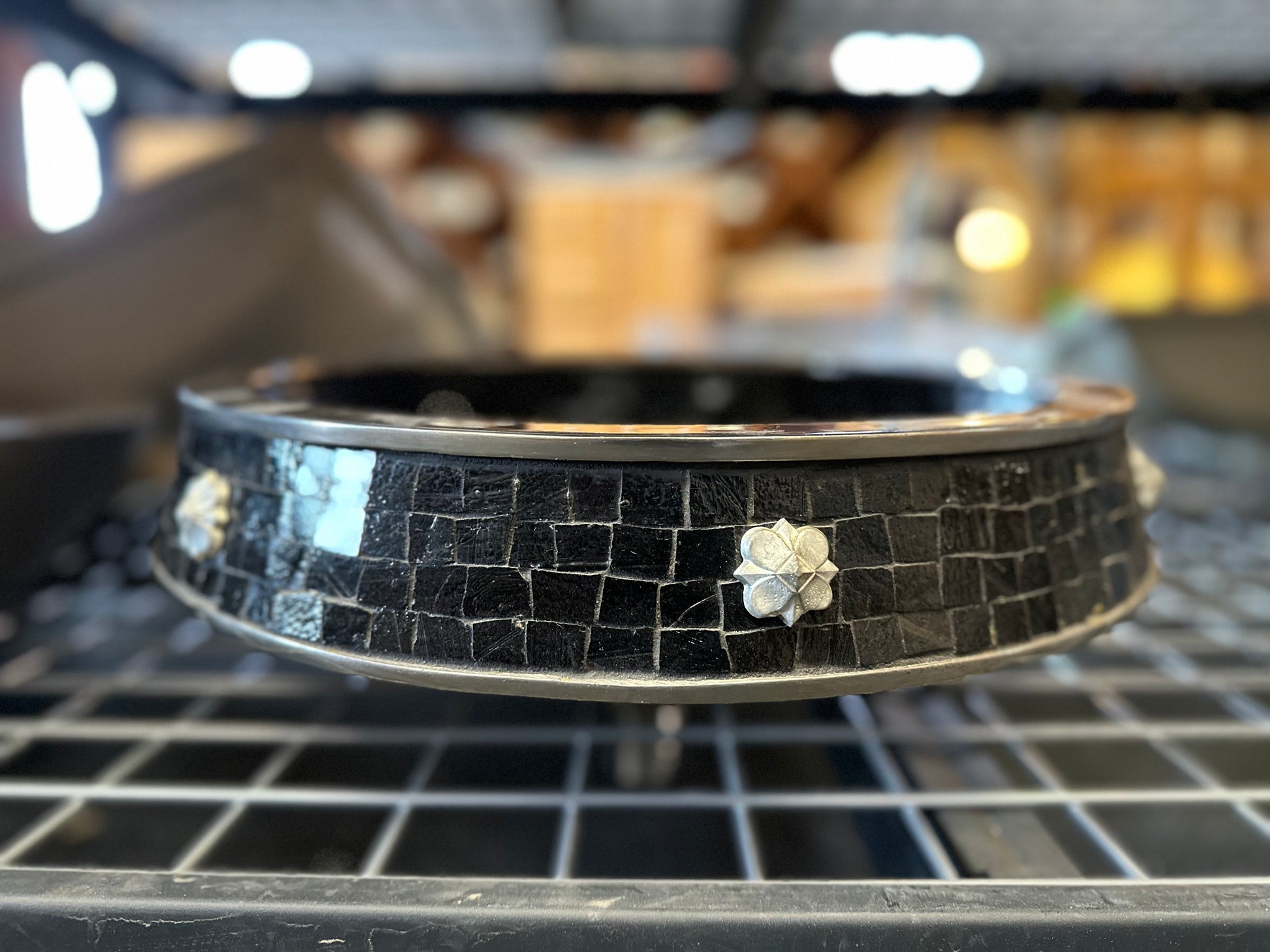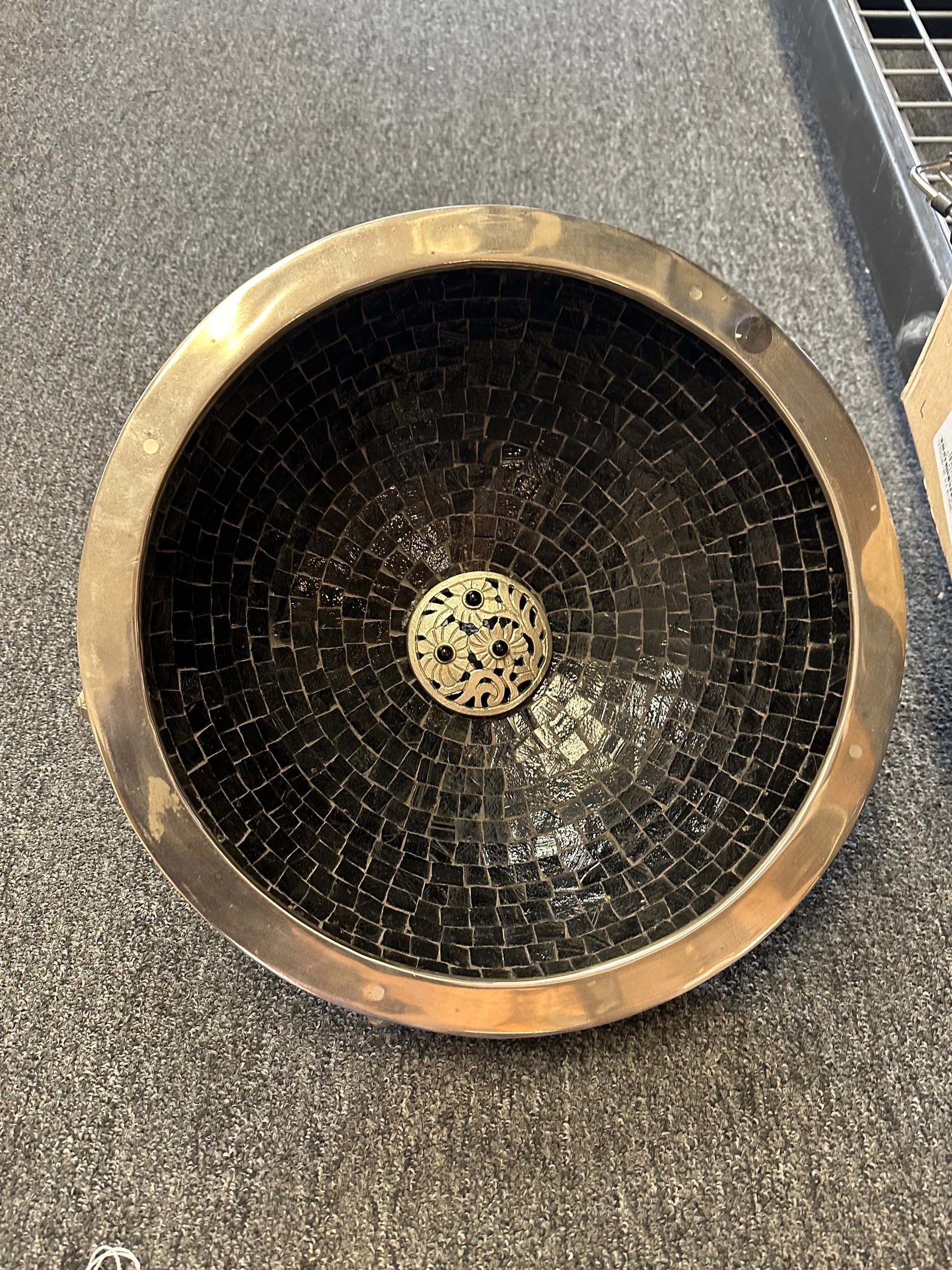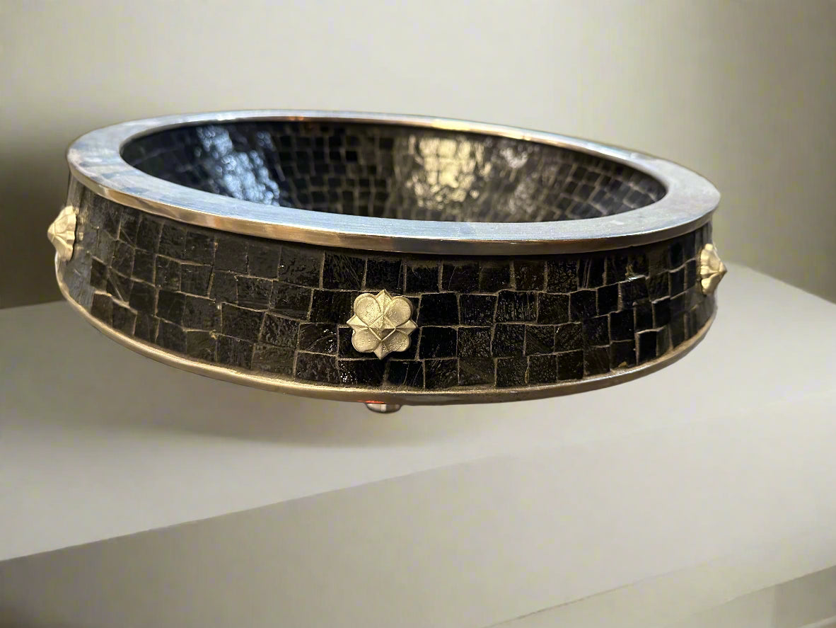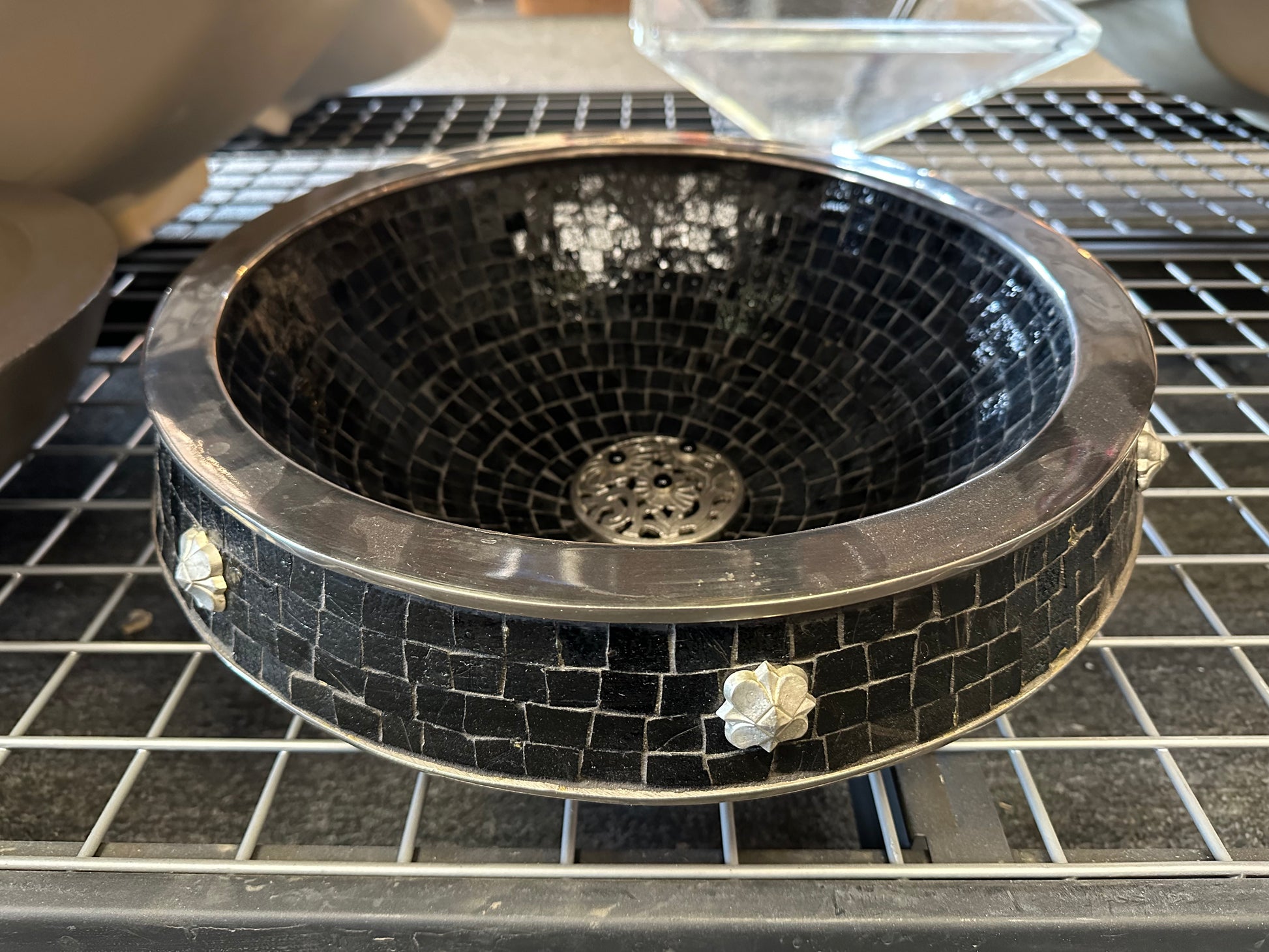 Beautiful vessel sink decorated with black mosaic inlays and white accent pieces. Manufactured by Linkasink
