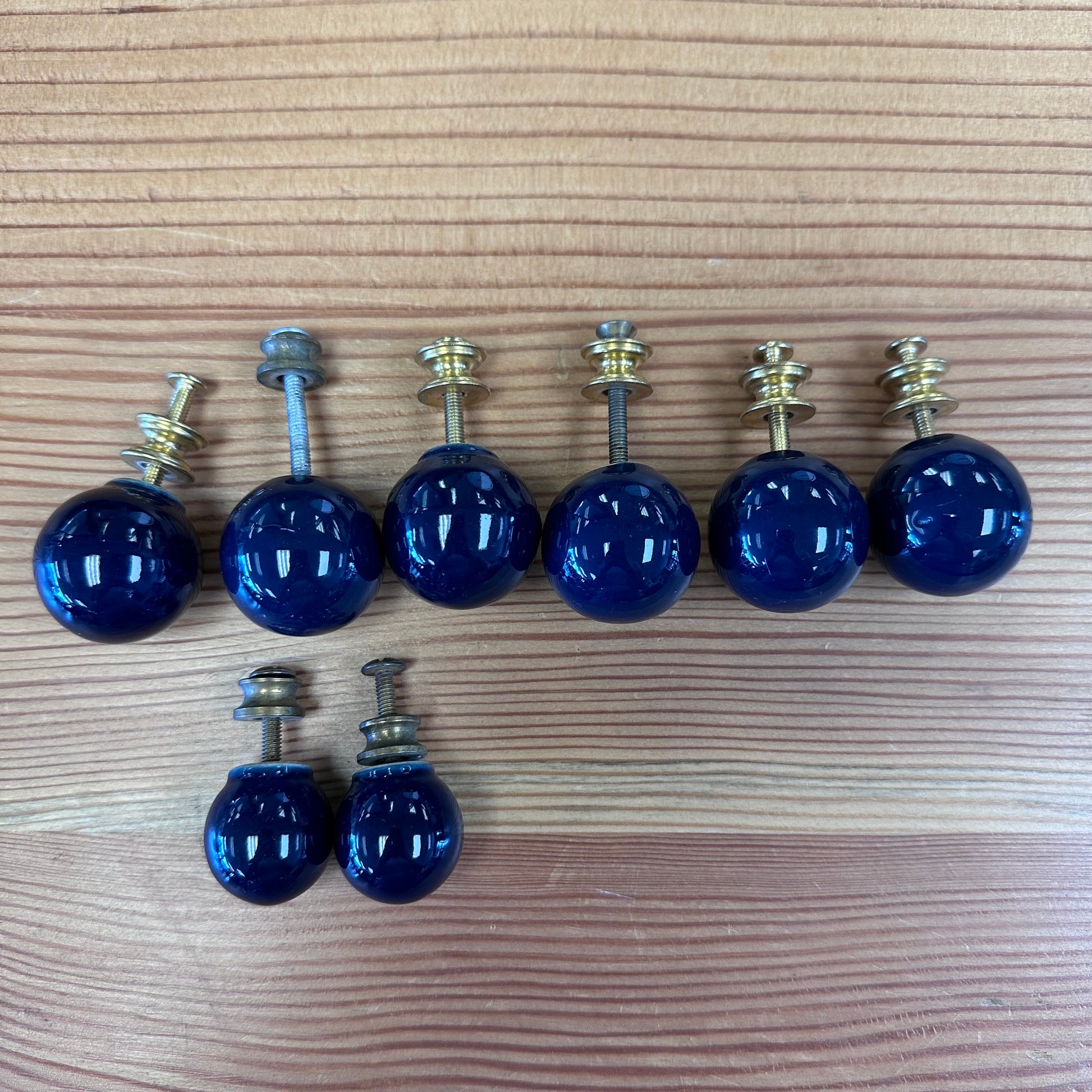 Looking to update or refresh your cabinet or dresser? These blue ceramic cabinet knobs are just the item to make your new or new to you furniture piece pop! 8 knobs total with a bright blue spheres with brass detailing.