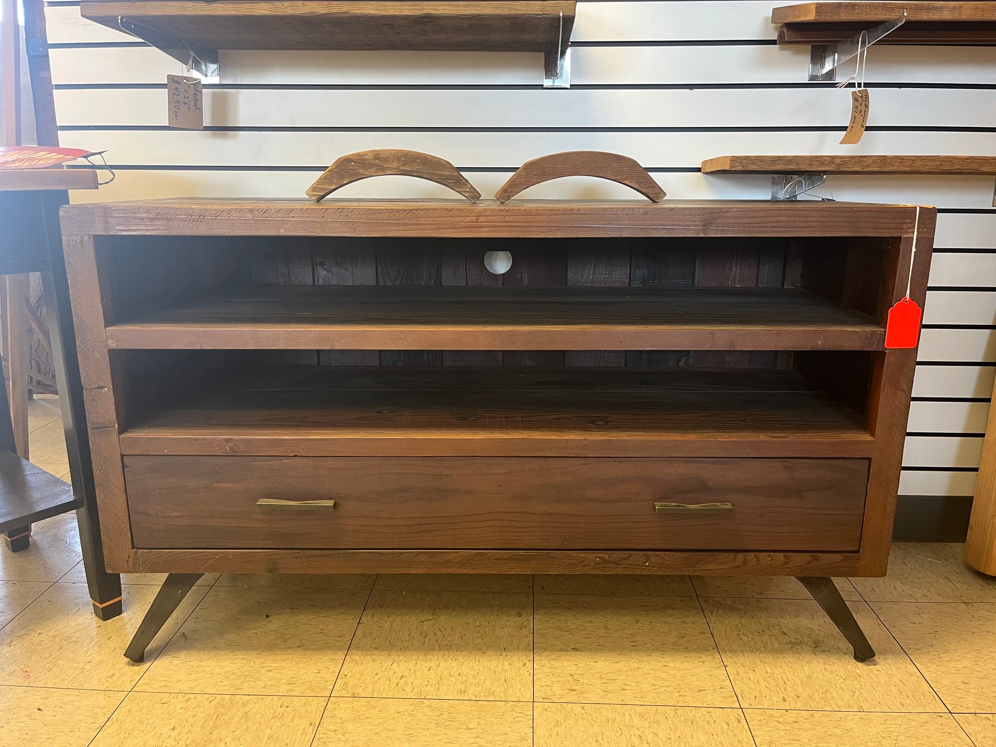 This media unit has the rustic charm of reclaimed redwood and an industrial style with black steel legs. With 2 drawers and 2 shelves, this provides much needed space for the extra gaming or stereo equipment for the gadget nerd!