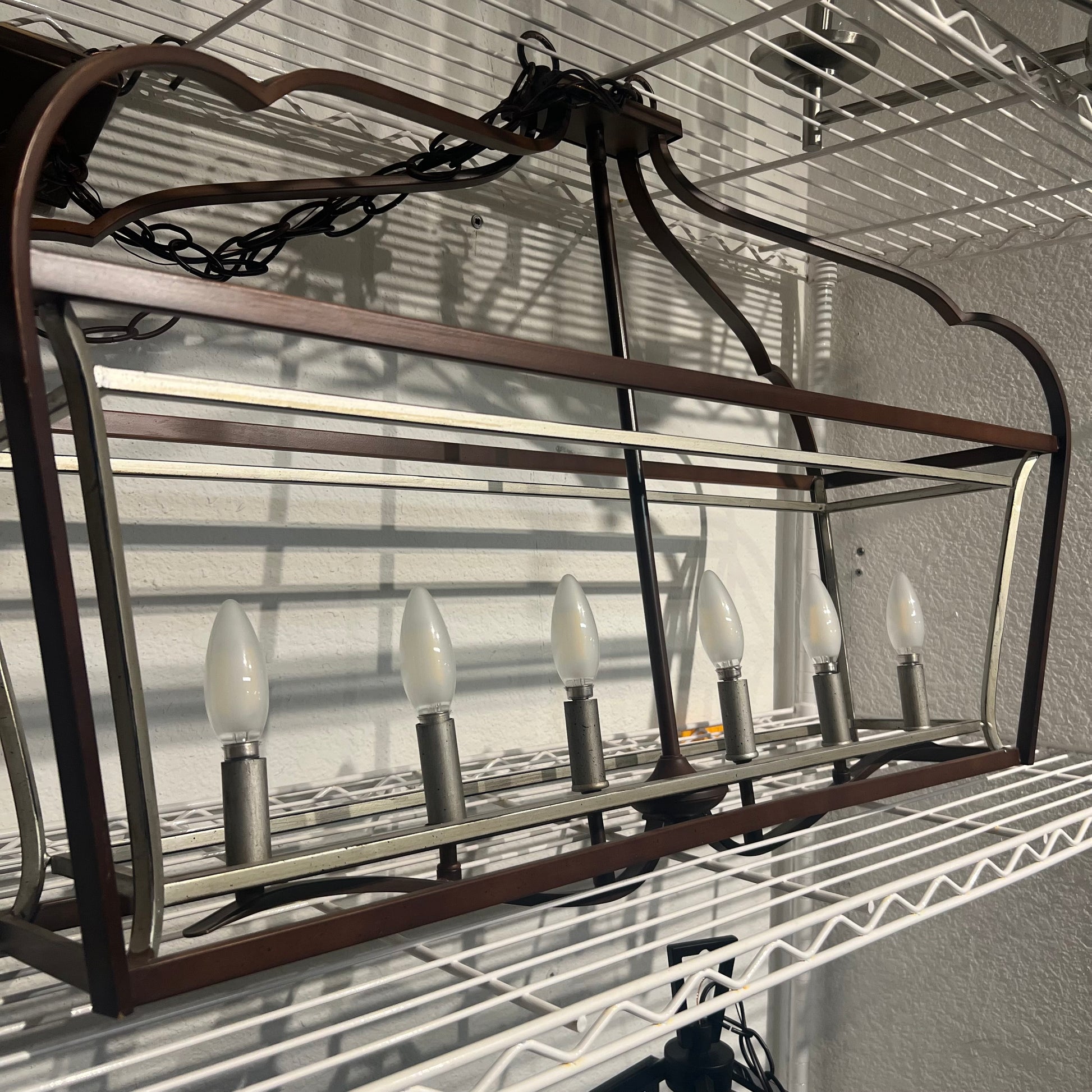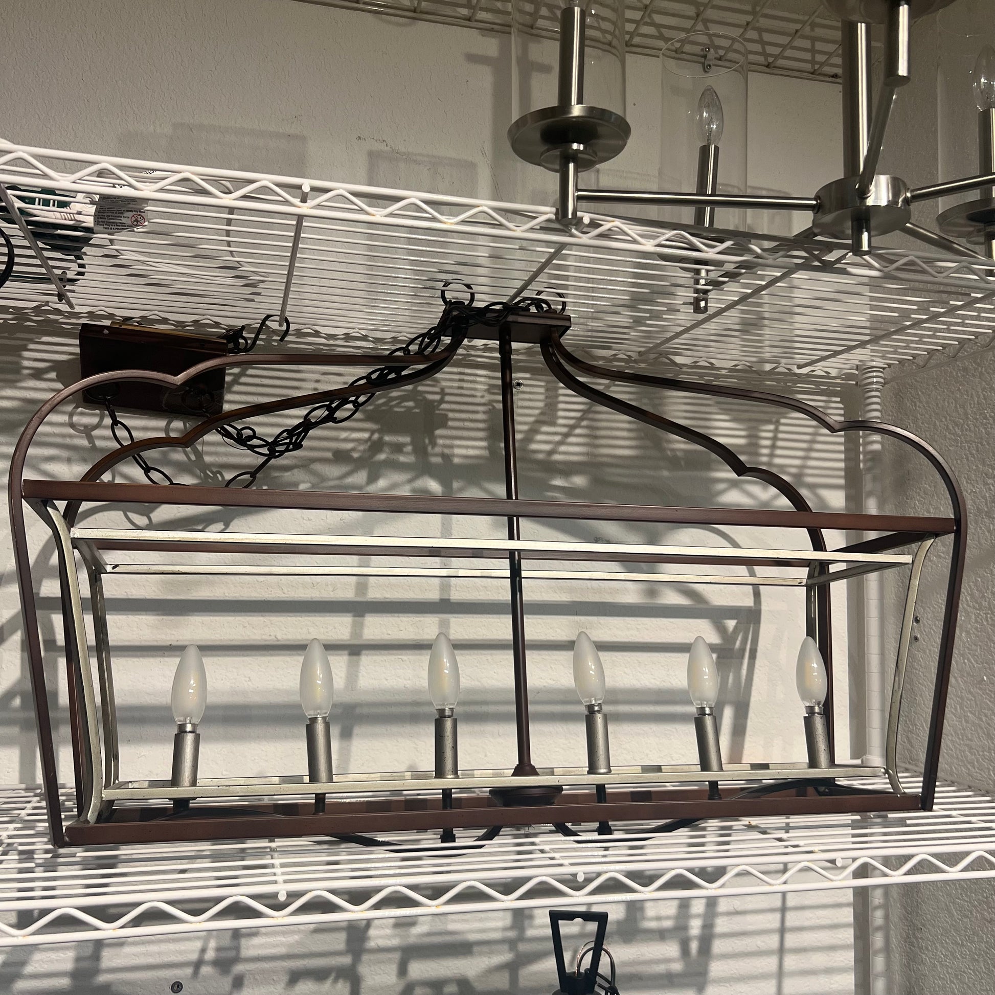 This rich, dark rubbed sienna finish transitional island pendant is crafted with an open, wide metal frame that blends the charm of an antique birdcage with the inviting allure of a classic hanging lantern. Its six lights are presented atop aged silver candles, surrounded by a delightful linear metal trim box in the same metallic finish. Adjust the hanging height to fit your space perfectly with the included matching chain. An inspiring addition to your beautiful home decor from Minka Lavery.