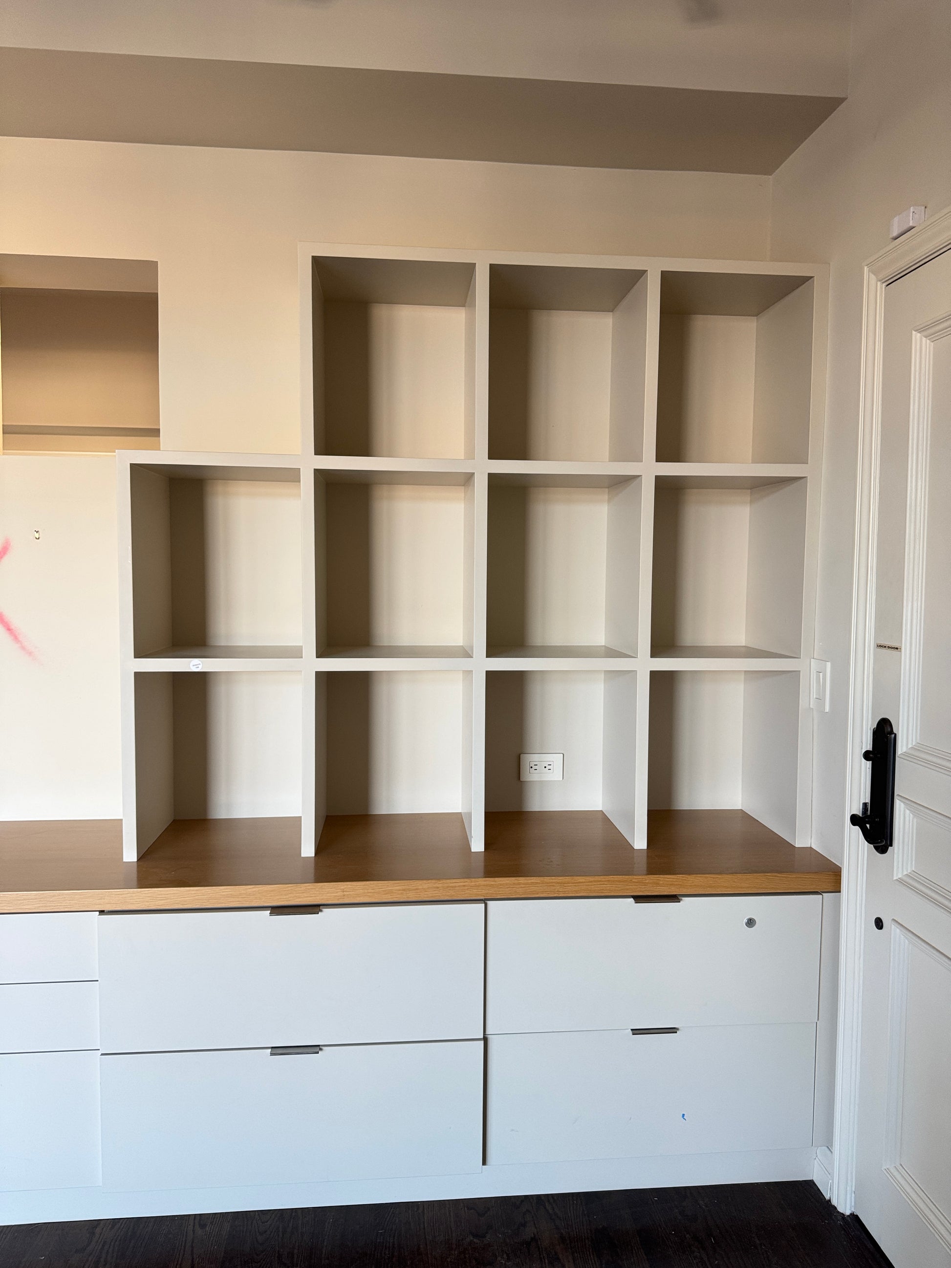 This desk has 6 drawers, and upper shelves for filing and organization.