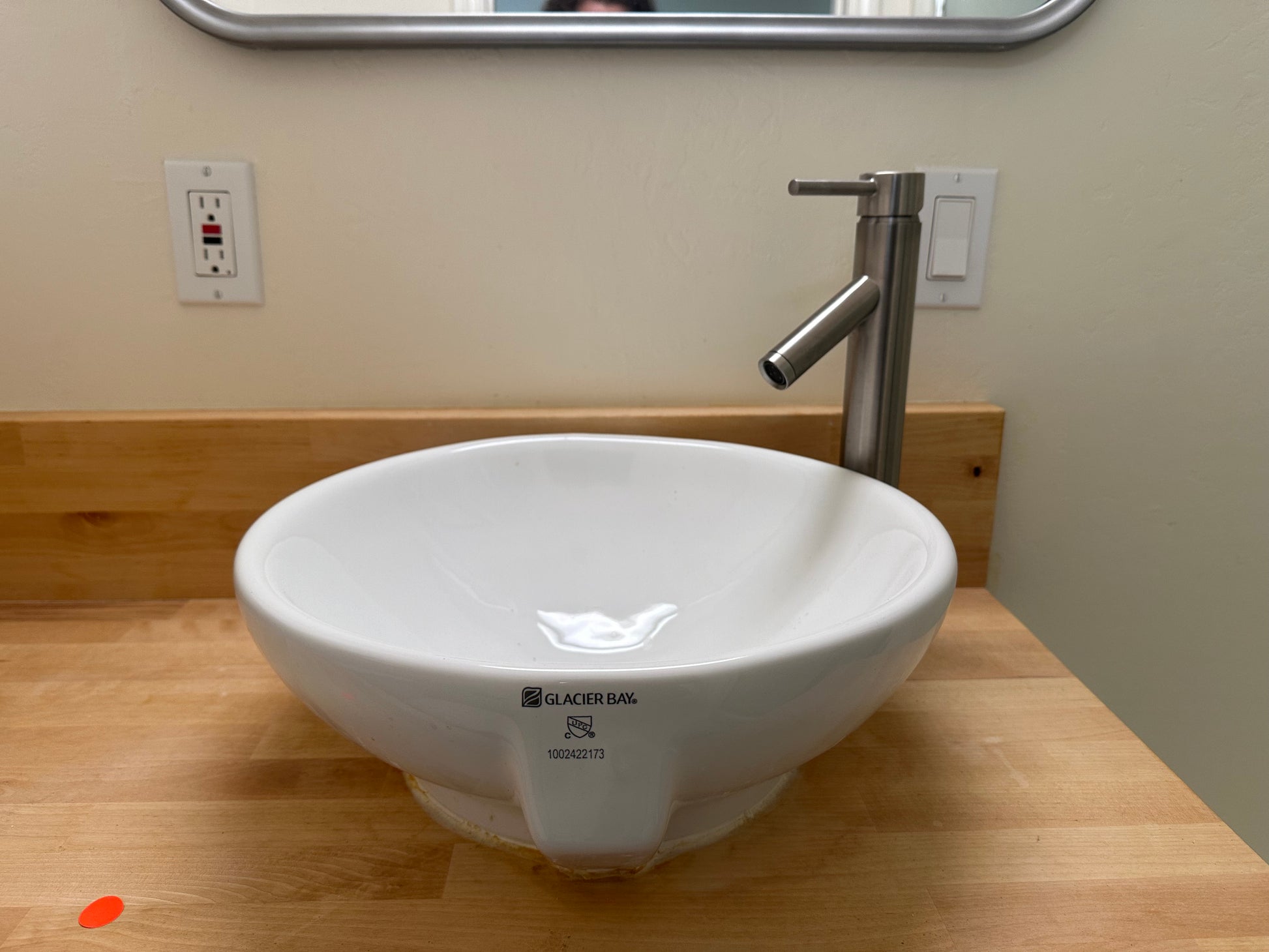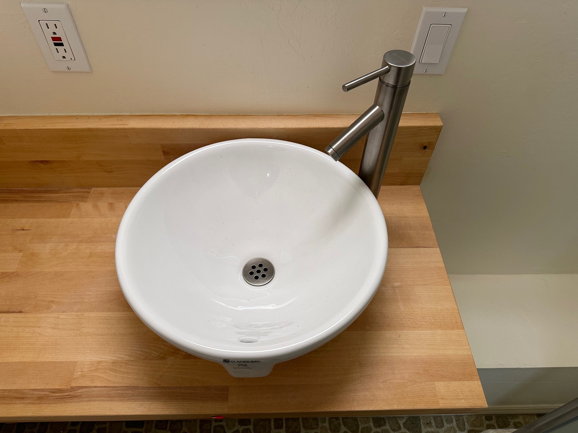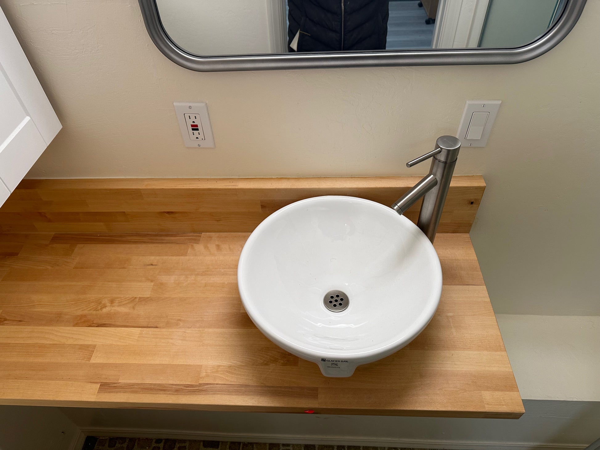 Glacier Bay Faucet and Vessel Sink on Butcher Block Vanity Countertop