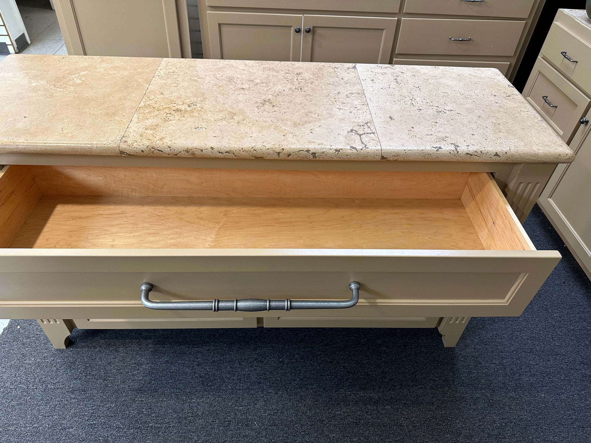 This cabinet features soft close, hardwood drawers with a granite countertop.