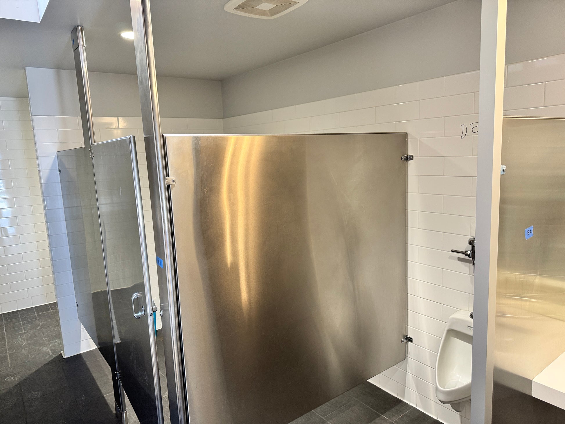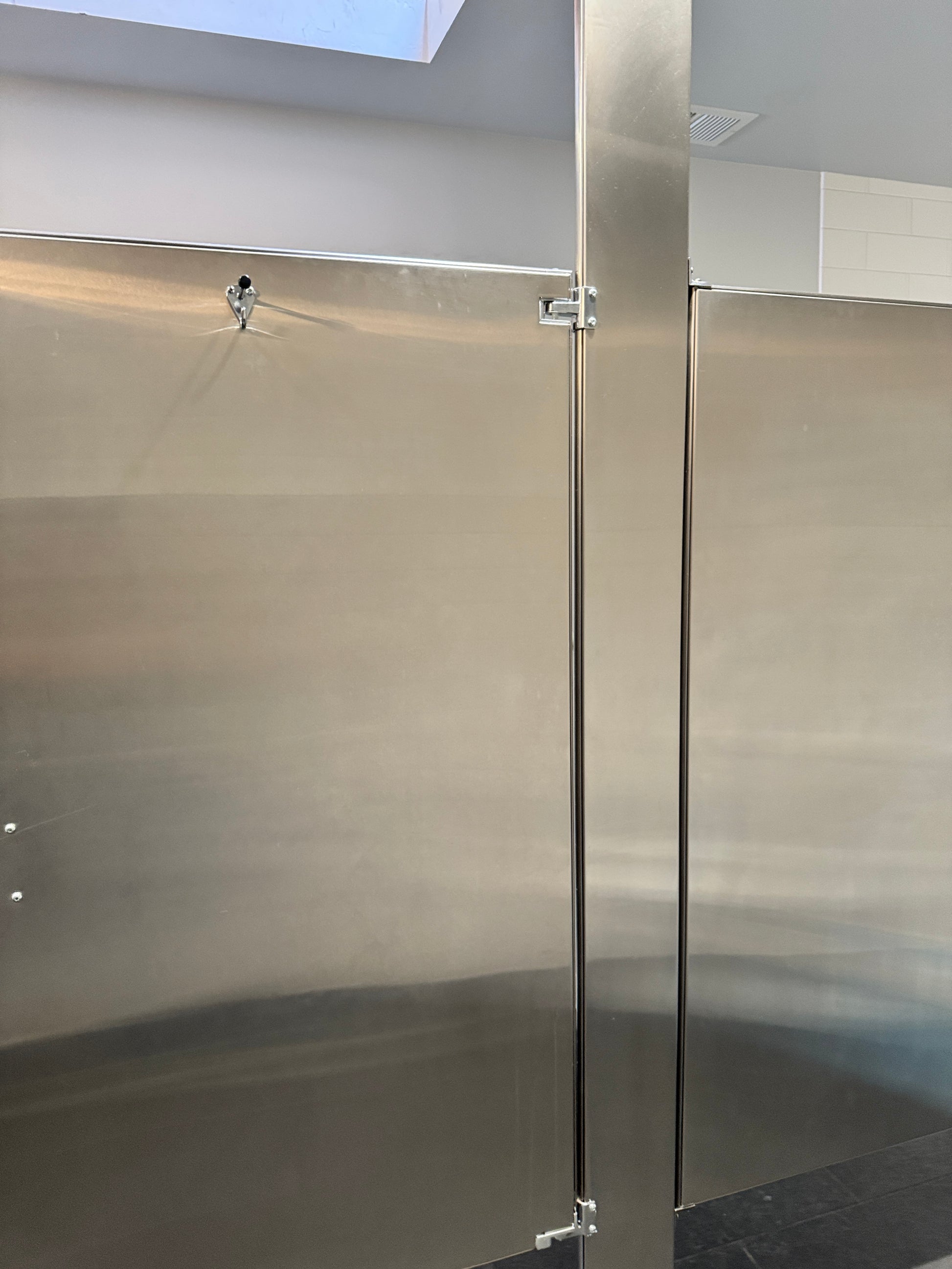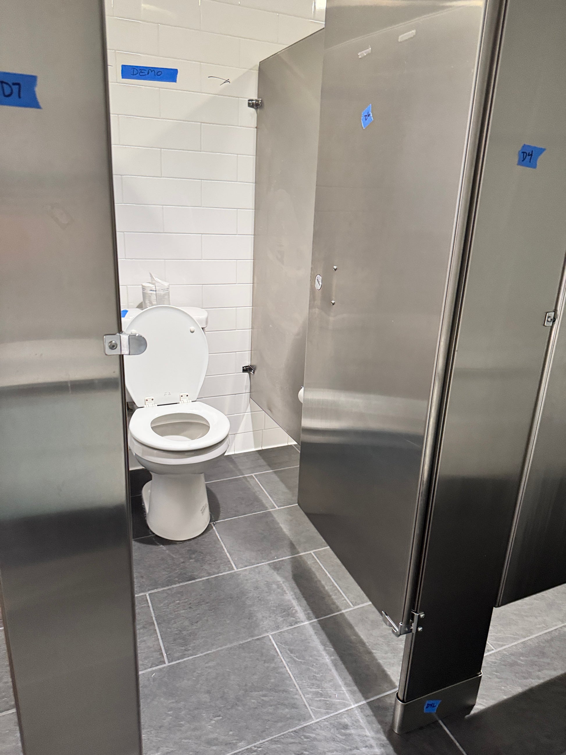 | A | Mens | stainless steel single stall 62 x 92 door opens out and swings left, Panel a1 against wall on left panel a5 on wall right | |||||